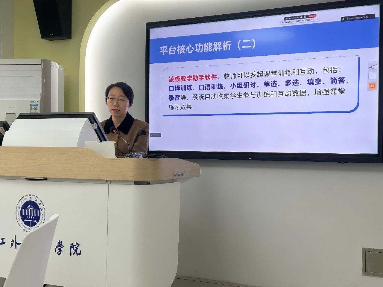在实践案例分享环节,王晓露以《口译听辨》课程为例,介绍了平台通过29个核心知识点图谱、55个语料案例资源库及沉浸式实训功能,助力学生精准学习、提升实战能力的教学成效。